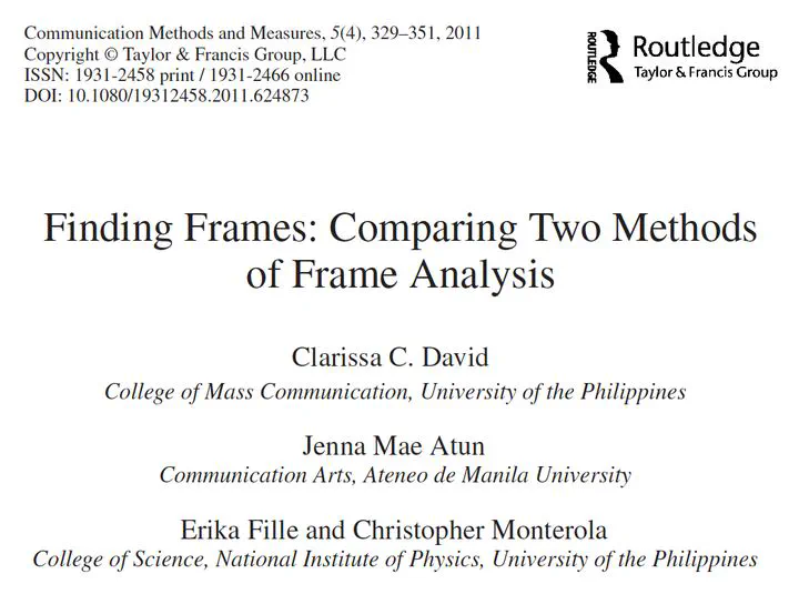 Detecting media frames has spawned a variety of methods, but very little has been done to investigate whether these methods provide comparable results. This article compares the results of two kinds of human coding framing analysis. The first is a method developed by Matthes and Kohring (2008) involving human coding of elements based on Entman’s (1993) definition of frames, and the second coding is based on an extracted set of frames. Cluster analysis of news articles on population published from 1987β2007 in the Philippines yielded an optimum number of three communities or frames that agree with the holistic predetermined frames. Results indicate support for the validity of both procedures. Methodological implications are further discussed.
